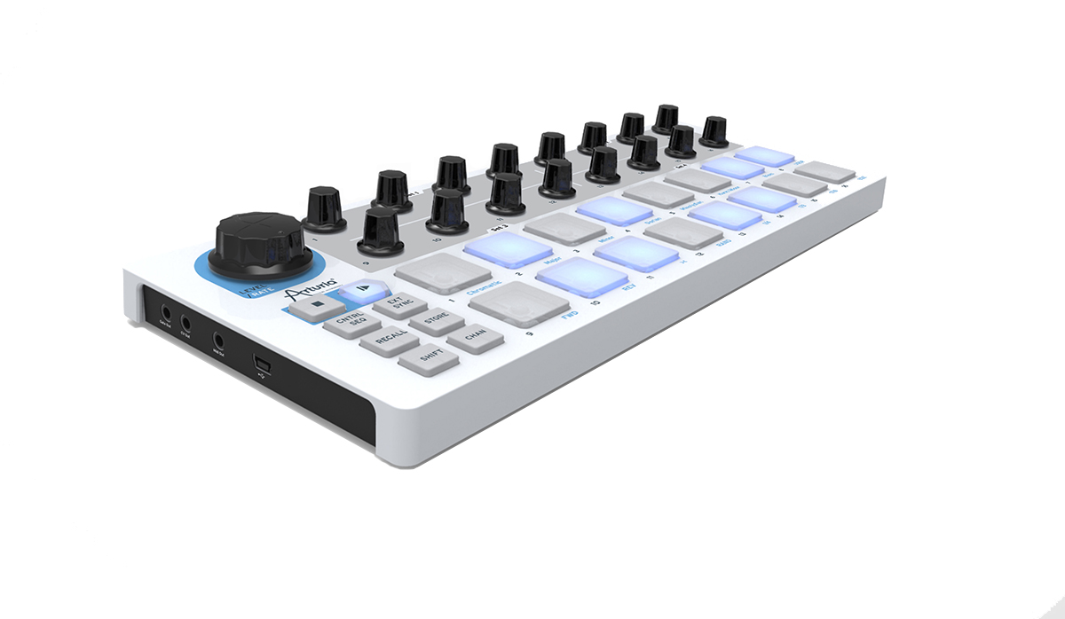 Arturia’s BeatStep offers a new degree of functionality and performance for a portable pad controller. BeatStep is highly versatile, capable of triggering clips in such applications as Ableton Live, it also allows you to play drums in conjunction with such applications as BFD or EZDrummer. BeatStep is also a 16-step analog sequencer for creating all kinds of musical phrases to be sent to analog synthesizers, MIDI drum machines, MIDI keyboard devices, or computer programs. Its vast connectivity allows you to interface BeatStep with a computer or iPAD using USB, a drum module using MIDI or an analog synthesizer equipped with CV/GATE.