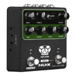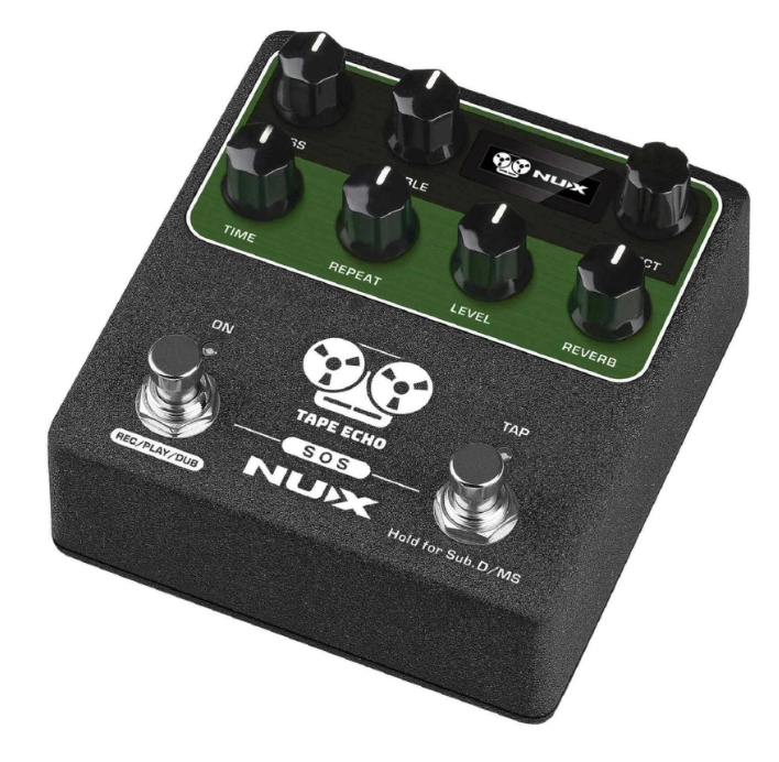 NUX TAPE ECHO is a tribute to the Japanese-made Space Echo from 1974. Analogue tape echo devices record incoming audio to a loop of magnetic tape, then replays the continuous loop over the playback head before it is erased again by new incoming audio. The Space Echo units used the standard 1/4″ tape designed to spool onto tape-reels, however, this device used no reels of any kind; the tape is transported via a capstan drive. The tape loop is contained in a loose, constantly moving jumble in the tape chamber (also known as the tape tank) under a plastic panel which protects the tape and keeps it from getting tangled. The design resulted in lower levels of noise, wow, and flutter, and cut down on tape wear. NUX TAPE ECHO uses Core-Image technology to capture these characteristics including BASS, TREBLE, REPEAT RATE (TIME), INTENSITY (REPEAT), ECHO VOLUME (LEVEL), REVERB VOLUME (REVERB), and physical features like WOW, FLUTTER, SATURATION. Even self-regenerate, self-oscillation using a dual foot switch stomp-box enclosure !